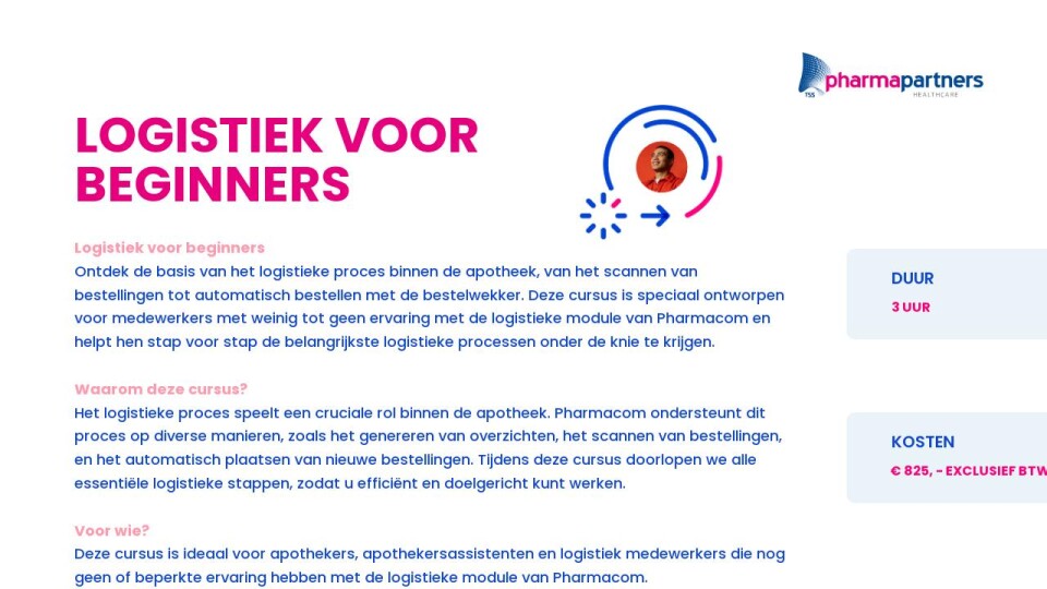 Deze cursus is ideaal voor apothekers, apothekersassistenten en logistiek medewerkers die nog geen of beperkte ervaring hebben met de logistieke module van Pharmacom.