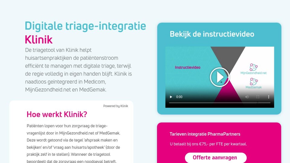 De triagetool van Klinik helpt huisartsenpraktijken de patiëntenstroom efficiënt te managen met digitale triage, terwijl de regie volledig in eigen handen blijft. Klinik is naadloos geïntegreerd in Medicom, MijnGezondheid.net en MedGemak.