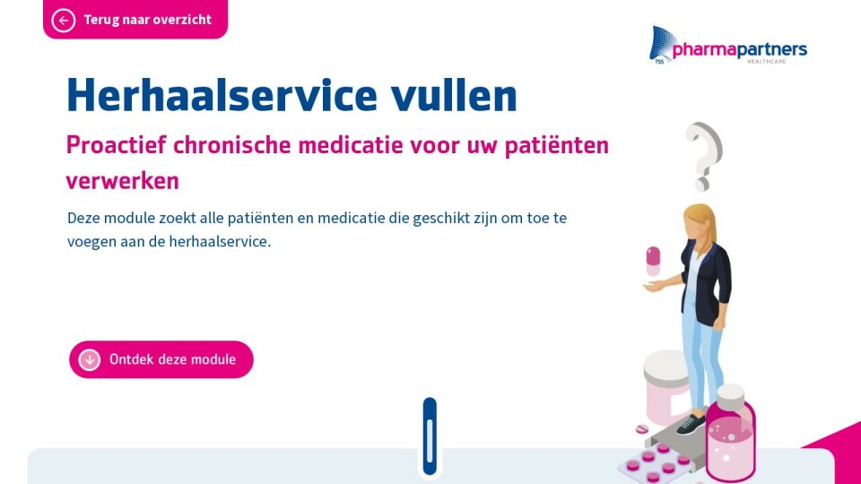 Deze module zoekt alle patiënten en medicatie die geschikt zijn om toe te voegen aan de herhaalservice.