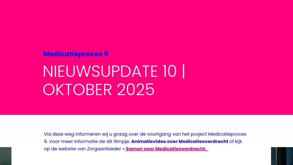 Via deze weg informeren wij u graag over de voortgang van het project Medicatieproces 9. Voor meer informatie zie dit filmpje: Animatievideo over Medicatieoverdracht of kijk op de website van Zorgaanbieder - Samen voor Medicatieoverdracht.