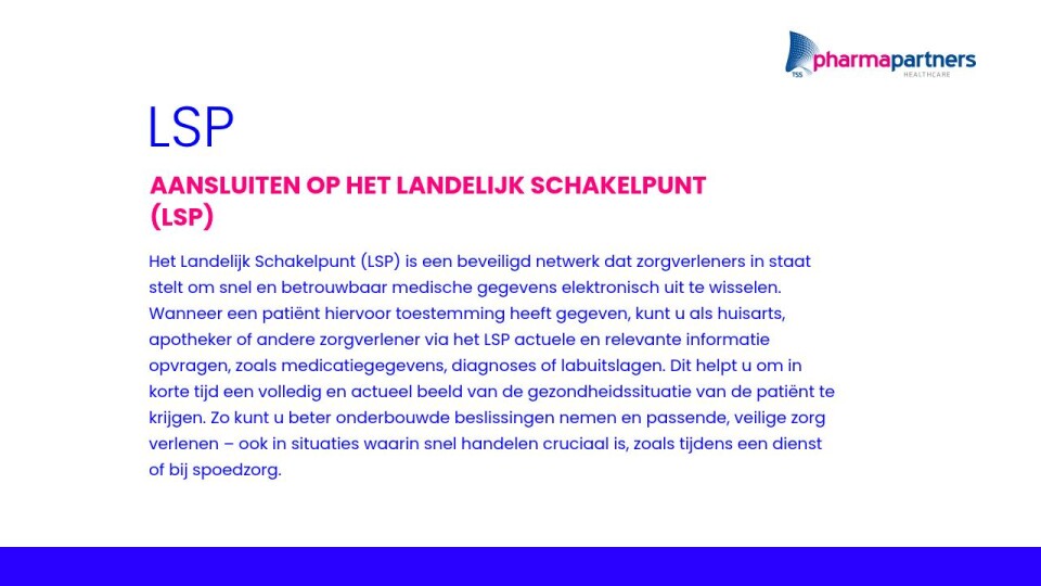 Het Landelijk Schakelpunt (LSP) is een beveiligd netwerk dat zorgverleners in staat stelt om snel en betrouwbaar medische gegevens elektronisch uit te wisselen. Wanneer een patiënt hiervoor toestemming heeft gegeven, kunt u als huisarts, apotheker of andere zorgverlener via het LSP actuele en relevante informatie opvragen, zoals medicatiegegevens, diagnoses of labuitslagen. Dit helpt u om in korte tijd een volledig en actueel beeld van de gezondheidssituatie van de patiënt te krijgen. Zo kunt u beter onderbouwde beslissingen nemen en passende, veilige zorg verlenen – ook in situaties waarin snel handelen cruciaal is, zoals tijdens een dienst of bij spoedzorg.