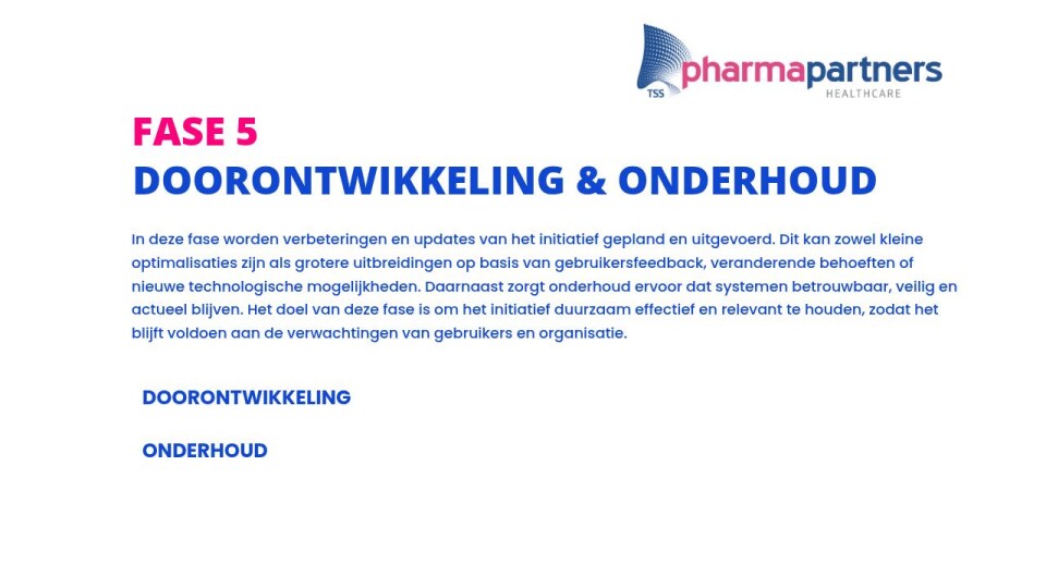 In deze fase worden verbeteringen en updates van het initiatief gepland en uitgevoerd. Dit kan zowel kleine optimalisaties zijn als grotere uitbreidingen op basis van gebruikersfeedback, veranderende behoeften of nieuwe technologische mogelijkheden. Daarnaast zorgt onderhoud ervoor dat systemen betrouwbaar, veilig en actueel blijven. Het doel van deze fase is om het initiatief duurzaam effectief en relevant te houden, zodat het blijft voldoen aan de verwachtingen van gebruikers en organisatie.