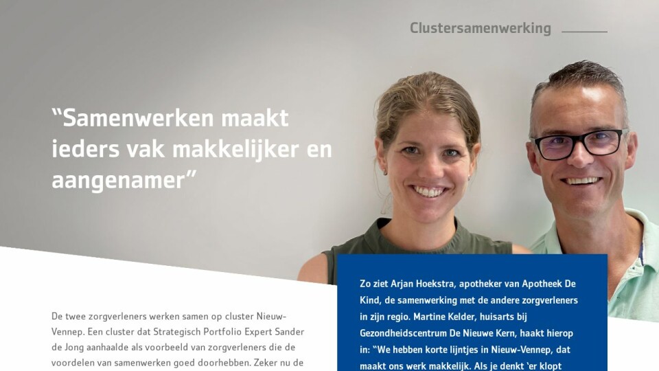 De twee zorgverleners werken samen op cluster Nieuw-Vennep. Een cluster dat Strategisch Portfolio Expert Sander de Jong aanhaalde als voorbeeld van zorgverleners die de voordelen van samenwerken goed doorhebben. Zeker nu de vraag aan zorgverleners om samen te werken, steeds luider wordt.