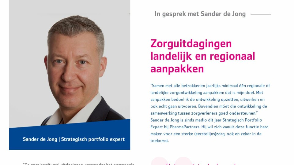 “Samen met alle betrokkenen jaarlijks minimaal één regionale of landelijke zorgontwikkeling aanpakken: dat is mijn doel. Met aanpakken bedoel ik de ontwikkeling opzetten, uitwerken en ook echt gaan uitvoeren. Bovendien móet die ontwikkeling de samenwerking tussen zorgverleners goed ondersteunen.” Sander de Jong is sinds medio dit jaar Strategisch Portfolio Expert bij PharmaPartners. Hij wil zich vanuit deze functie hard maken voor een sterke (eerstelijns)zorg, ook en zeker in de toekomst.