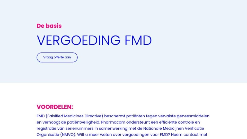 FMD (Falsified Medicines Directive) beschermt patiënten tegen vervalste geneesmiddelen en verhoogt de patiëntveiligheid. Pharmacom ondersteunt een efficiënte controle en registratie van serienummers in samenwerking met de Nationale Medicijnen Verificatie Organisatie (NMVO). Wilt u meer weten over vergoedingen voor FMD? Neem contact met ons op.